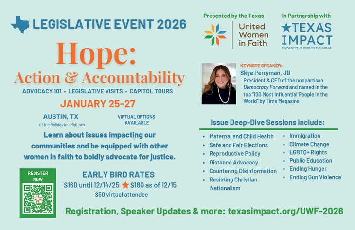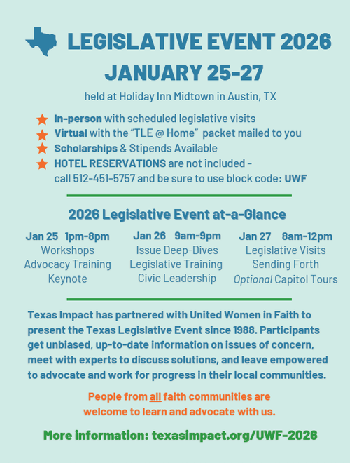 This is a mission of the United Women in Faith across Texas. UWFaith members planned and organized the event with Texas Impact, and invited others to participate, learn and make a difference. Because we INCLUDE, not exclude, this event was open to all women in Faith and sisters of these denominations attended the 2025 event: