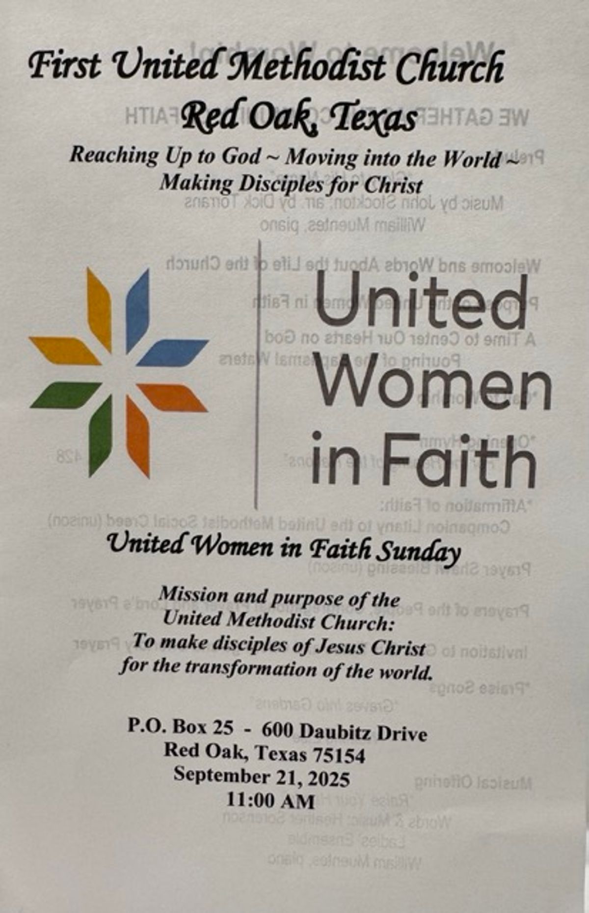 pg 2 of bulletin: UWFaith Sunday at McMillan UMC in Fort Worth, TX on September 28, 2025